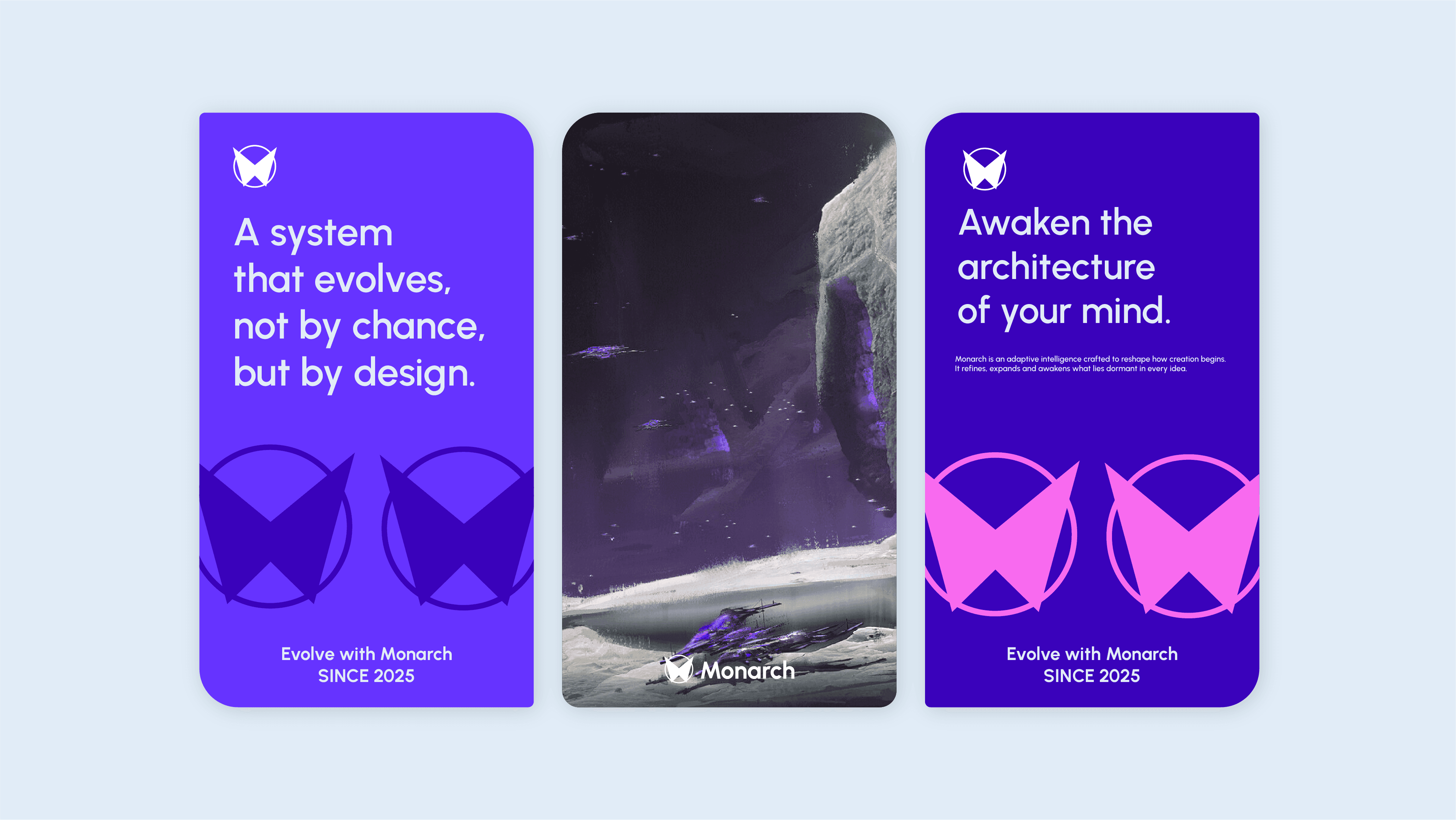 Monarch is a conceptual AI brand that draws its identity from the evolution of the Monarch butterfly. The project explores how natural transformation can be reinterpreted through technology, creating a visual language centered on symmetry, precision, and controlled motion.